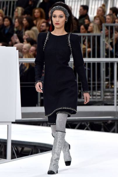 Sparkly celestial knee-high boots are the only way to dress your legs next winter. Saint Laurent sent them out in slouchy iterations last week; Chanel’s intergalactic version were more ladylike, sporting the customary double-C toe cap.