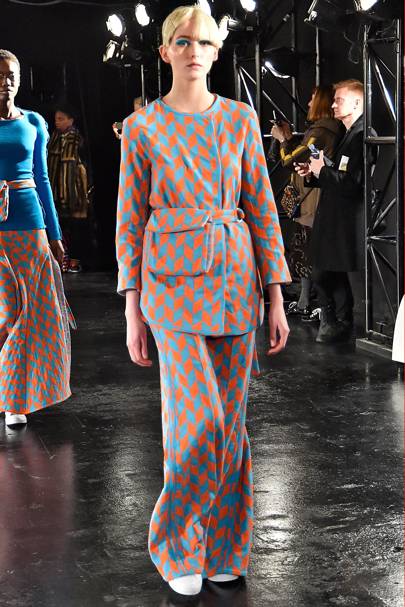 Steinmetz has always stuck to her guns - when she breezed through the reception of the LCF campus where I was waiting for her that morning, I had noted her purposeful walk. Also her natural rebelliousness: as we reached her studio, her pomerian, Buzz, hopped out of her canvas shoulder bag, seemingly out of nowhere. "He's not allowed in here, so I have to hide him," she giggled. Some of the strongest pieces in her spring collection continue what Steinmetz has set out to do ever since she bought a loom on a whim for £150 from the Handweavers Studio in Finsbury Park, and taught herself to weave from YouTube tutorials: they reenergise the artisan.