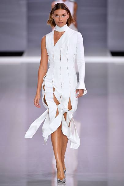 Ralph’s silk-crepe opening look, was studded with rows of glittering buttons and strategically placed slits. It played the flirty peekaboo game to perfection. “It’s very elegant. It’s very simple but there’s something very sexy about it. You don’t have to show it all, you can hint," she counsels.