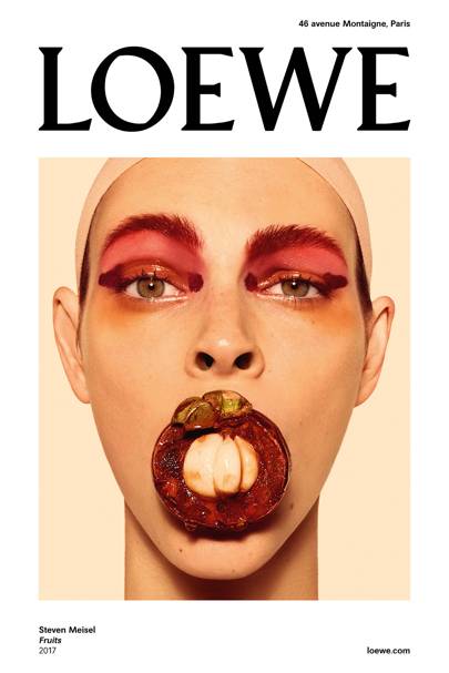 For their new campaign, Anderson and Meisel are presenting Vittoria Ceretti, remarkably made-up by Pat McGrath, in an Edenic exploration of contemporary consumption. This afternoon, one of these pictures will be distributed as the invitations to Loewe’s spring/summer 2018 fashion show, while simultaneously being plastered onto 500 Parisian news kiosks. “Each time we do a campaign, it has to challenge the entire team, and it has to be something we can put in windows, put on the street. It’s propaganda,” says Anderson. Then, on Friday, they will decorate the brand’s newly minimalist show space in the form of giant hanging tapestries.