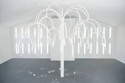 The young artists behind Studio Swine, the couple first created the installation with COS for Salone del Mobile in April this year. “It’s joyful, but there’s a tinge of melancholy in there as well,” Groves reflected. “We like that there’s something clean and mechanic about it and the architecture of it, but it’s also quite messy. It plays with natural phenomena: fluid moving around, the bounce of it, the mess on the floor.” The event marked COS’s first event at Art Basel and cemented the brand’s ongoing devotion to the art scene and its emerging talent. “From day one we’ve done a lot of research on art and created our seasonal directions in-house,” its creative director Karin Gustafsson explained. “That’s not unique in the fashion world, but that’s the approach we’ve taken. Art is what makes us think and therefore we felt quite early that it would make sense for us to do collaborations.”