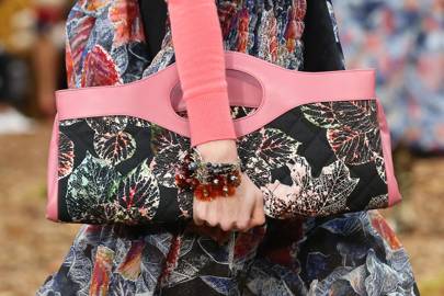 The name of Chanel’s new shopper tote, 31 refers to the address of Chanel’s flagship store on Rue Cambon. Large and rectangular with distinctive circular handles and a long shoulder strap, it came in several colours and finishes. Some were printed with autumnal leaves and worn with matching jackets. Models carried them folded over like a newspaper or gently cupped the bottom of the tote with a hand. Despite its size the 31 has day-to-night potential. Kaia Gerbereven accessorised her black lace cocktail dress with the capacious new shopper.
