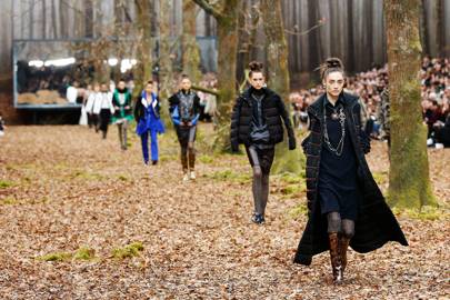 There were 80 models each wearing an individual look. The show opened with a series of long, lean maxi coats, some in speckled tweed, others sprouting feathers from the shoulders or hem. Quilting - usually reserved for Chanel’s handbags - was used on wide trousers and an oversized down padded version of the classic braid-trimmed Chanel jacket brought a whole new meaning to street chic. The only print was a recurring motif of autumnal leaves, splashed over chiffon high-necked mini dresses and shawl-collared jackets. The show closed with a parade of ultra feminine black cocktail and evening gowns trimmed with ribbons, lace and tulle.