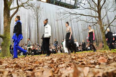 An avenue of nine 17-metre-tall oak trees were transplanted from a forest in the Perche region of north-western France to the vast, glass-ceilinged exhibition space at the Grand Palais. The trees formed a living corridor down the centre of the runway, which aped a natural forest floor, complete with autumnal leaves, soil, moss, twigs and tree roots. The audience sat on planks made from tree trunks. After the show all the trees were recycled - their trunks were sent to a sawmill to be cut into planks and their branches and leaves were turned into shavings and composted