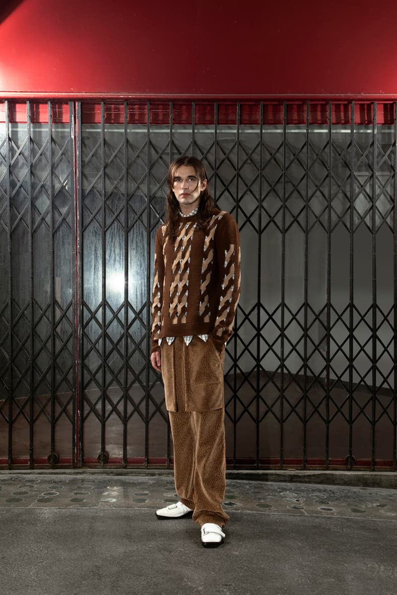 Upon examination, we see loafers made from patent gray leather that is contrasted by a busy lace situation, and coupled with these are a pair of tracksuit-like pants that are both baggy yet formal, detailed with yellow stripes on the seams. This look is complete with an oversized double-breasted blazer made from mottled and cracked brown leather, paired with a double-button button-down shirt.