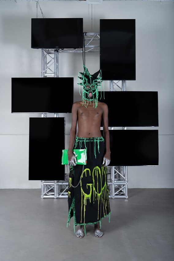 In collaboration with handmade streetwear label, The End is Near, daring sci-fi face masks feature protruding horns and exposed stitching that dangles in mid-air, paired with a quilted maxi dress emblazoned with “GOD’S MISTAKE” text. A Better Mistake is here to set the tone when it comes to mind-bending collections that leave viewers in awe, and its MFW debut was definitely a spectacle not to be missed.