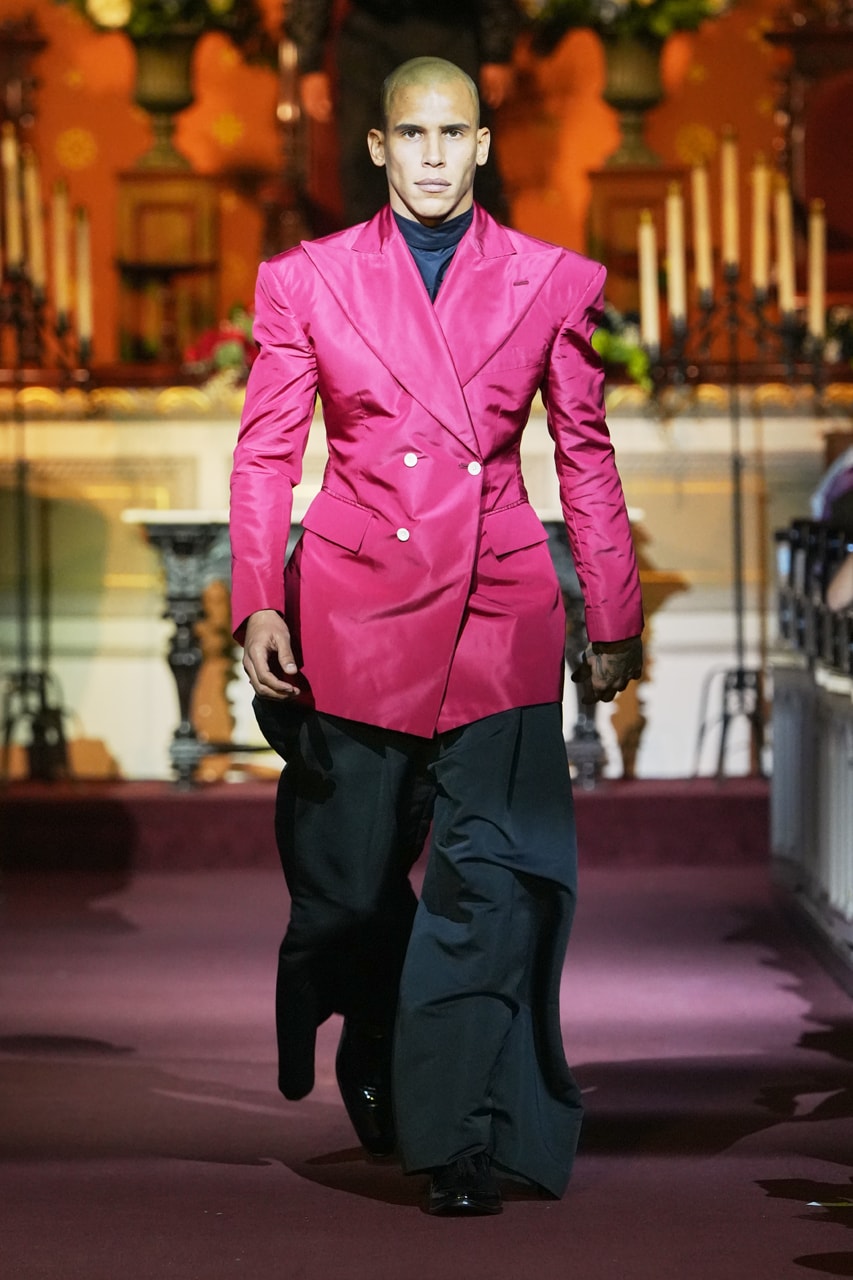 The pandemic’s doom and gloom have weighed heavy on consumers and designers alike over the past two years, and in opposition to that melancholy, several brands have decided to glitz up offerings for next season with shimmering lace and decadent suiting. Lace’s association of being an intimate fabric is noted here, as it’s being shown in a barely-there way. Its presence in next season’s menswear is depicted in a cool manner with button-up shirts or thin tanks. As well, suiting for men has become ornate with extra-wide lapels and plush fabrications – noted in Willy Chavarria’s voluminous sets and silk floral appliqué.